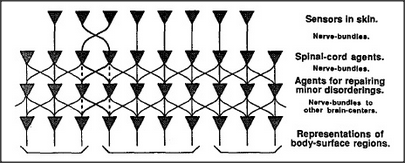 Given enough such information, a suitably designed agency could assemble a sort of map to represent which spots are close together on the skin. Because there are many irregularities in the nerve-bundle pathways from skin to brain, the agencies that construct those maps must be able to "tidy things up." For example, the mapping agency must learn to correct the sort of crossing-over shown in the diagram. But that is only the beginning of the task. For a child, learning about the spatial world beyond the skin is a journey that stretches over many years.