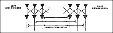 Let's do one more experiment: touch one ear and then touch your nose. They don't feel very similar. Now touch one ear and then the other. These touches seem more similar, although they're twice as far apart. This may be in part because they are represented in related agencies. In fact, our brains have many pairs of agencies, arranged like mirror- images, with huge bundles of nerves running between them.