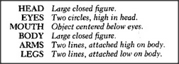 An adult would never make such a "mistake," since once some feature has been assigned to represent a head, that feature is thereafter regarded as "used up" or "occupied" and cannot represent anything else. But the child has less capacity or inclination for "keeping track." Accordingly, since that "large closed figure" satisfies the description's requirements for both the head and the body — albeit at different moments of time — there is no cause for discontent. The little artist has satisfied all the conditions required by its description!