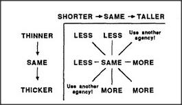 Consider that the Spatial agency in our Society-of-More is not really involved with space at all, but with interactions between agents like Tall and Thin. If you were told that one object A is both taller and wider than another object B, you could be sure that there is "more" of A. But if you were told that A is taller and thinner than B, you couldn't be sure which one is "more." An interaction-square array provides a convenient way to represent all the possible combinations: