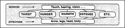 This diagram depicts a separate agency for each of several "basic needs." Let's call them "proto-specialists." Each has a separate mini-mind to do its job and is equipped with special sensors and effectors designed to suit its specific needs. For example, the proto-specialist for Thirst might have a set of parts like these: