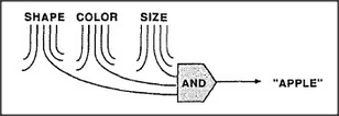 When we see an apple, how do we know it as an apple? How do we recognize a friend — or even know when we're seeing a person? How do we recognize things? The simplest way to recognize something is to verify that it has certain properties. To recognize an apple, in many circumstances, it might suffice to look for something that is red AND round AND apple-sized. In order to do that, we need a kind of agent that detects when all three conditions occur at once. The simplest form of this would be an agent that becomes active whenever all three of its inputs are active.