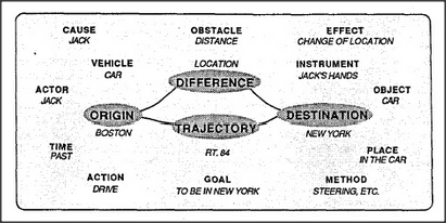 Why propose this particular structure instead of some other arrangement? Because I suspect that Trans-like structures have a special prominence in how we think. One reason is that some sort of bridgelike scheme seems indispensable for making those all- important connections between structures and functions. Without that bridge trajectory, it might be hard to connect what we learn about things to what we learn about using them. Also, in order to use chainlike thinking skills, we need to be able to represent what we know in ways that provide connection points for roles like Origins, Destinations, and Differences. All these requirements suggest the use of bridgelike frames.
