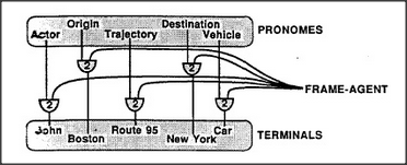 When a frame-agent is activated — either by seeing, hearing, or imagining something — this supplies each of those AND-agents with one of these two inputs. The second input is provided by some pronome which can thereby activate whichever agent or frame is presently assigned to that terminal. If several pronomes are active at the same time, all the corresponding agents will be activated, too. When the frame above is active, the pronome for Origin will activate the K-line for Boston, and the pronome for Vehicle will activate the K-line for car.
