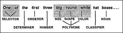 If this were done by using word-string sentence-frames, it would require a separate frame for each different number of adjectives. Another scheme would not use any frames at all but have the language-agency convert each adjective, as it arrives, into some corresponding neme. And yet another scheme to handle this (still popular among some grammar theorists) would have each successive adjective arouse a new subframe inside the previous one. However, when we look more closely at how people use adjectives, we find that these strings are not simple at all. Compare the two phrases below: