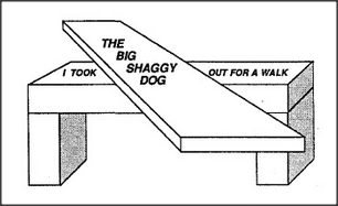 Some language scholars seem to think that what we do in language is unique, in the filling of frames with other frames to open up a universe of complicated structure-forms. But consider how frequently we do similarly complex things in understanding visual scenes. The language-agency must be able to interrupt itself, while handling one phrase, to work on parts of another phrase, and this involves some complex short-term memory skills. But in vision, too, there must be similar processes involved in breaking scenes apart and representing them as composed of objects and relationships. The picture below suggests how similar such processes may be. In language, the problem is to recognize that the two words "took" and "out" both belong to the same verb phrase, although they are separated in time. In vision, the problem is to recognize the two regions of a tabletop as being parts of the same object, although they are separated in space.