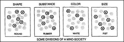 We make our new ideas by merging parts of older ones — and that means keeping more than one idea in mind at once. Let's oversimplify matters for the moment and imagine that the mind is composed of many "divisions," each involved with a different activity, like vision, locomotion, language, and so forth. This pattern repeats on smaller scales, so that even the thought of the simplest ordinary object is made up of smaller thoughts in smaller agencies. Thinking about a small white rubber ball could activate some divisions like these: